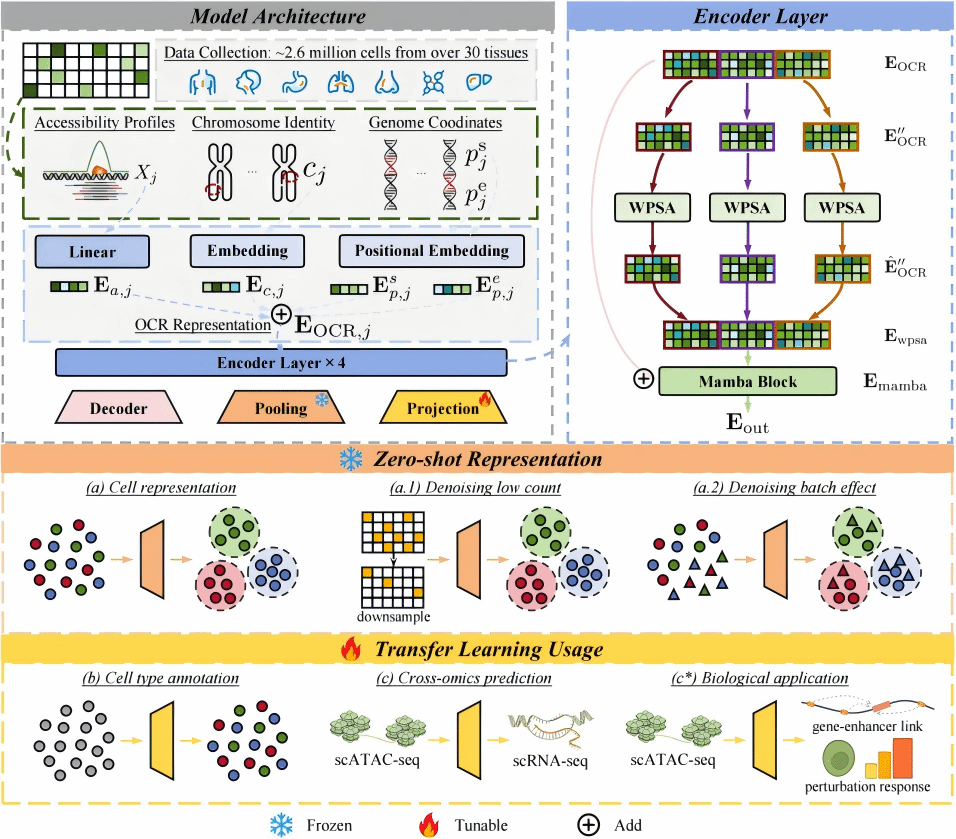 团队研发的 ChromFound模型——是首个系统性实现全基因组长程建模与跨组织泛化的单细胞染色质可及性测序(scATAC-seq)基础模型。