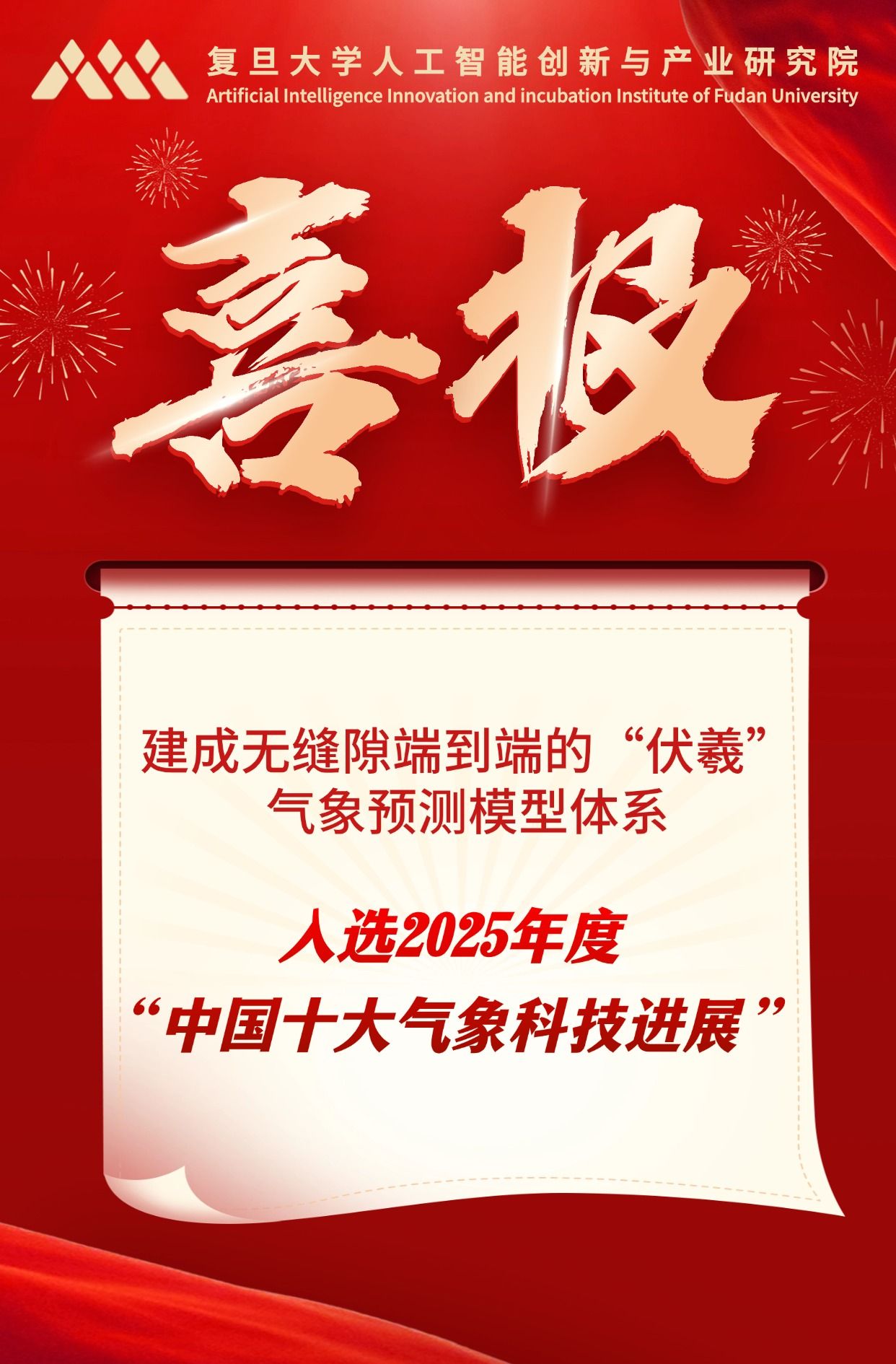3月21日,在2026年世界气象日主题活动中,2025年度“中国十大气象科技进展”发布。李昊研究员牵头,复旦大学与上海科学智能研究院联合研发的“建成无缝隙端到端的‘伏羲’气象预测模型体系”成功入选。